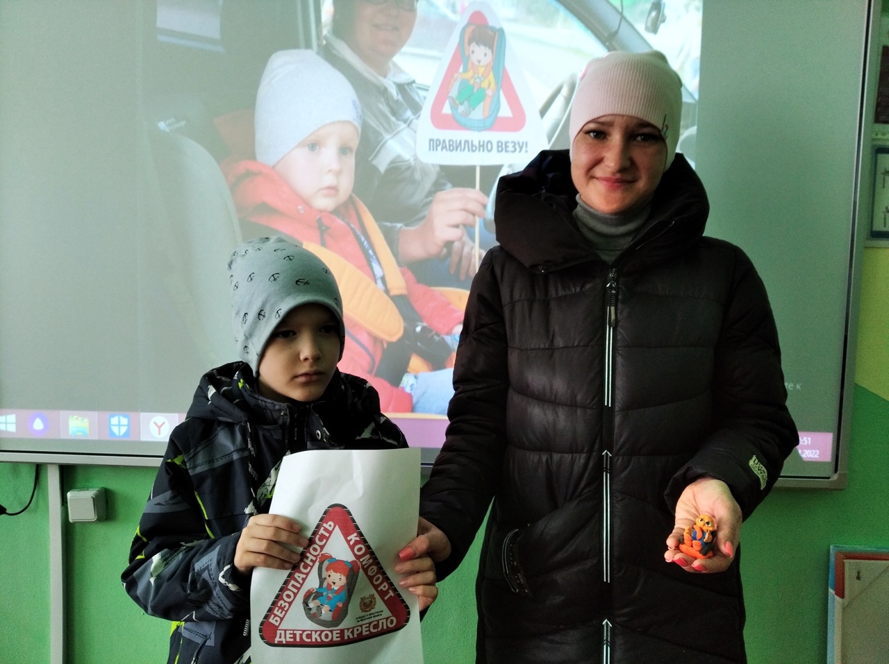 под руководством классного руководителя, учителя Саможеновой Г.П. совместно с учащимися 1 «Д» класса и их родителями (законными представителями) приняли активное участие в акции "Безопасный пассажир". На классном часе учащиеся с ТМНР просмотрели обучающий мультфильм «Детское автомобильное кресло» и совместно с учителем изготовили поделки из пластилина «Безопасный пассажир». С детьми и их родителями были проведены профилактические беседы: «У ПДД каникул нет!», «Ребёнок-главный пассажир!», «Учись правильно пристёгиваться». С целью профилактики дорожно-транспортных происшествий, каждый ребёнок подарил в подарок родителям свою поделку «Безопасный пассажир» (фигура ребёнка-пассажира в автокресле).