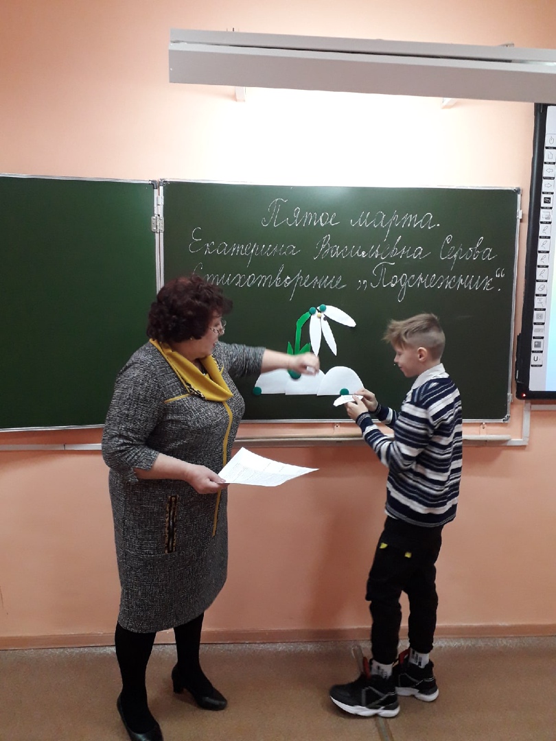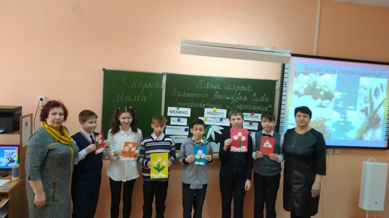 Сегодня в рамках декадника интегрированных уроков провели открытый урок по чтению и труду в 5а классе учителя Еремина В.М. и Кашина Е И. Ребята окунулись в весеннюю атмосферу при знакомстве с творчеством Е.Серовой, читали ее стихотворение "Подснежник", а затем выполнили открытки к празднику 8 Марта. На уроке большое внимание уделялось речевому развитию ребят, расширению их словарного запаса и сведений о мире растений весной.