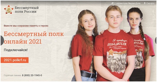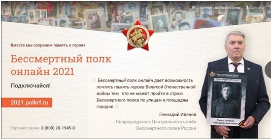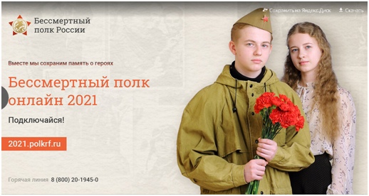 В 2021 году центральным штабом Общероссийского движения «Бессмертный полк России» в связи с заключением Роспотребнадзора, связанным с текущей эпидемиологической ситуацией, принято решение отказаться от проведения шествия Бессмертного полка, обеспечив при этом реализацию акции «Бессмертный полк Онлайн».