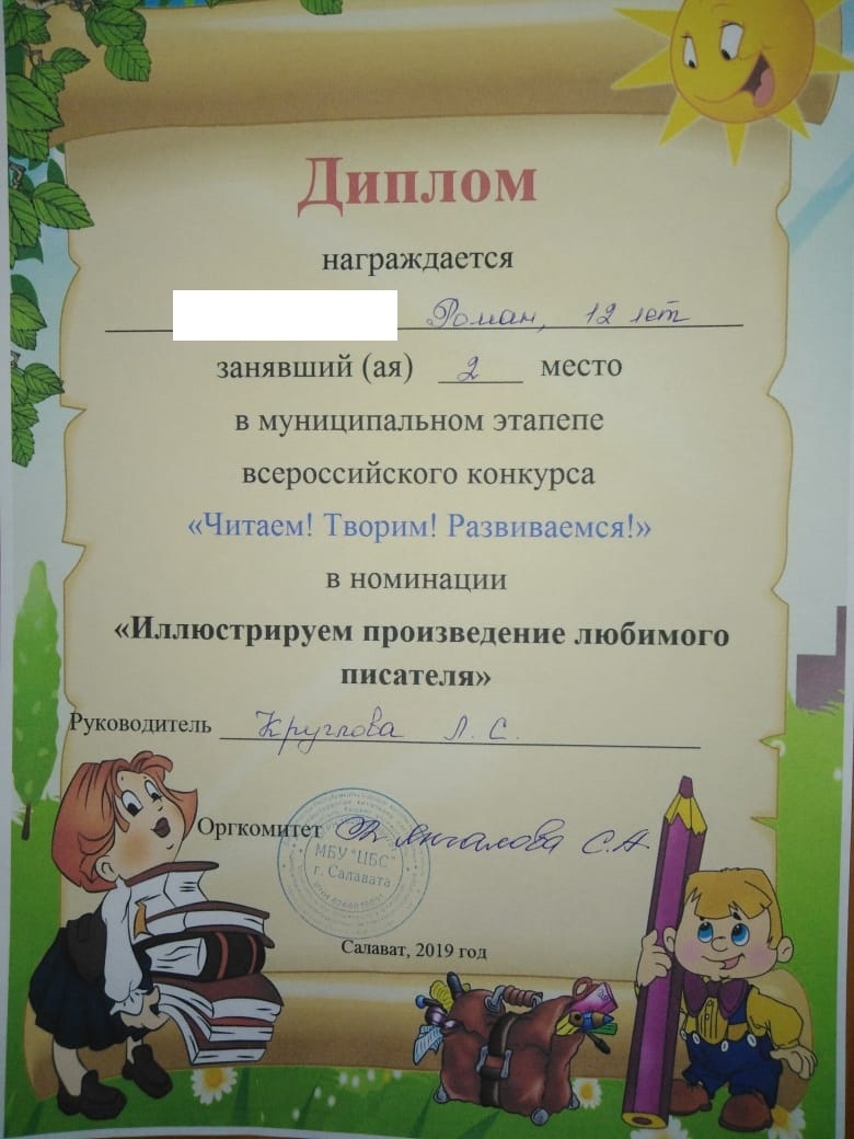 23 марта в рамках Всероссийского конкурса "Читаем! Творим! Развиваемся!" в библиотеке №9 г. Салавата прошёл конкурсный отбор в муниципальном этапе конкурса «Иллюстрируем произведение любимого писателя». Поздравляем победителей конкурса: