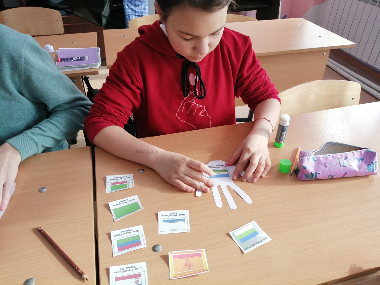 Результатом классного часа стало совместное творчество обучающихся. Каждому было дано задание: обвести, вырезать и раскрасить свою ладонь, затем наклеить на неё флаг выбранной республики, входящей в состав России. Ребята пришли к выводу, что в России, представляющей собой многонациональное государство, русский язык является средством межнационального общения.