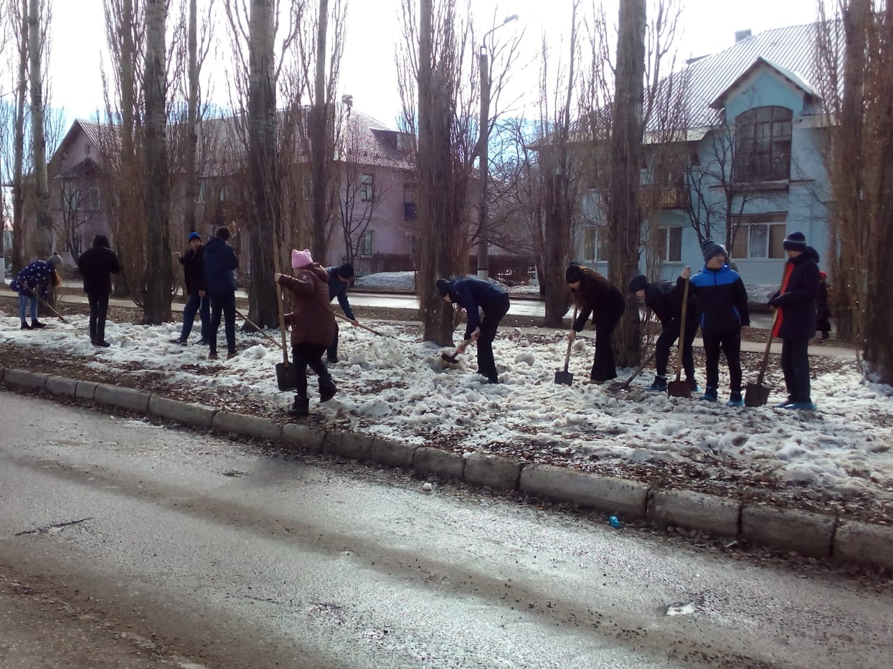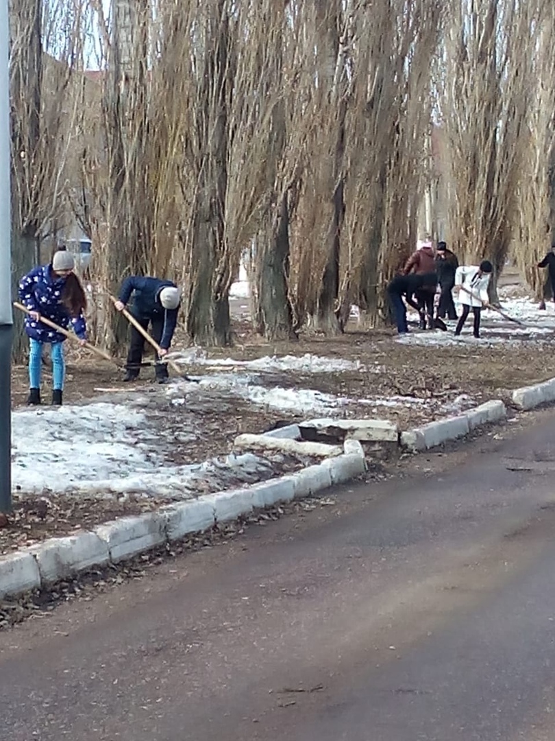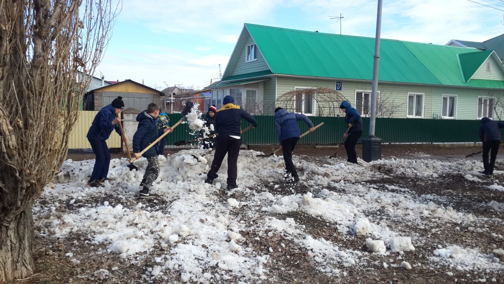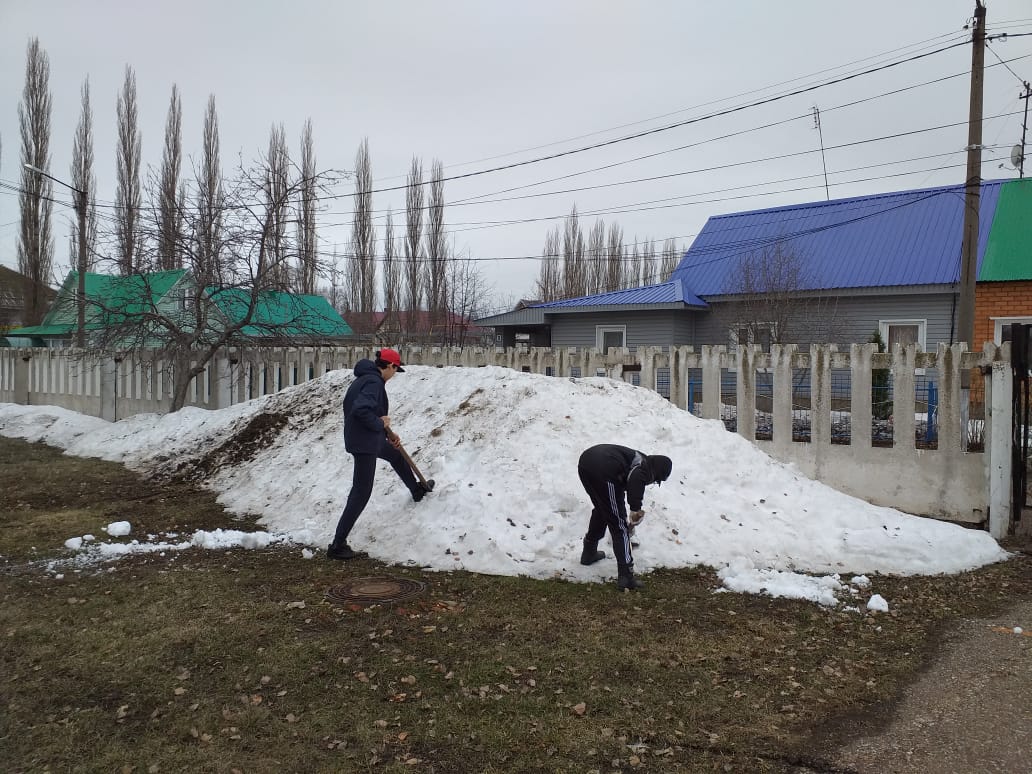 5 апреля обучающиеся старших классов проводили раскидывание снега на территории школы