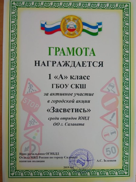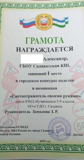 Поздравляем 1 "а" класс, который принял активное участие в городской акции "Засветись", среди отрядов ЮИД ОО г.Салавата (руководитель - Губайдуллина Ф.Ф.). А также М. Александра, занявшего I место в городском конкурсе поделок в номинации "Светоотражатель своими руками" среди ЮИД обучающихся 5-9 классов ОО и УДО г.Салавата (руководитель - Замилова З.Р.). Дальнейших творческих успехов!Молодцы!