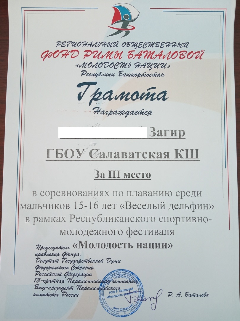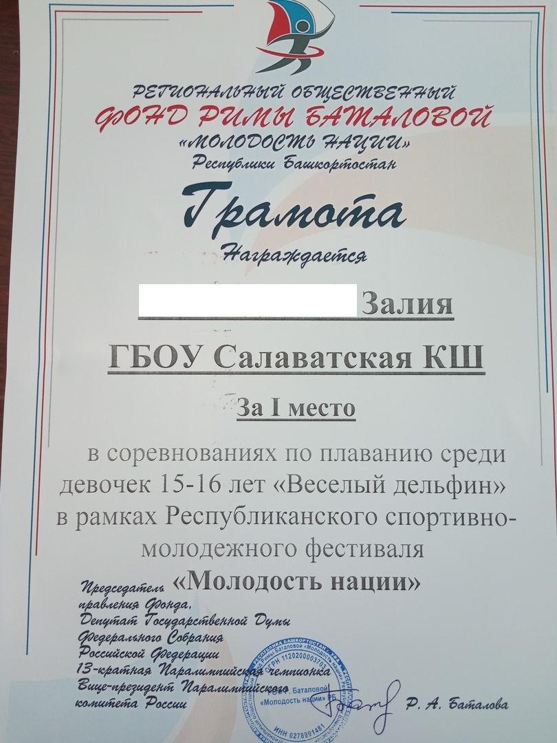 З.Залия - I место в соревнованиях по плаванию среди девочек 15-16 лет "Весёлый дельфин";