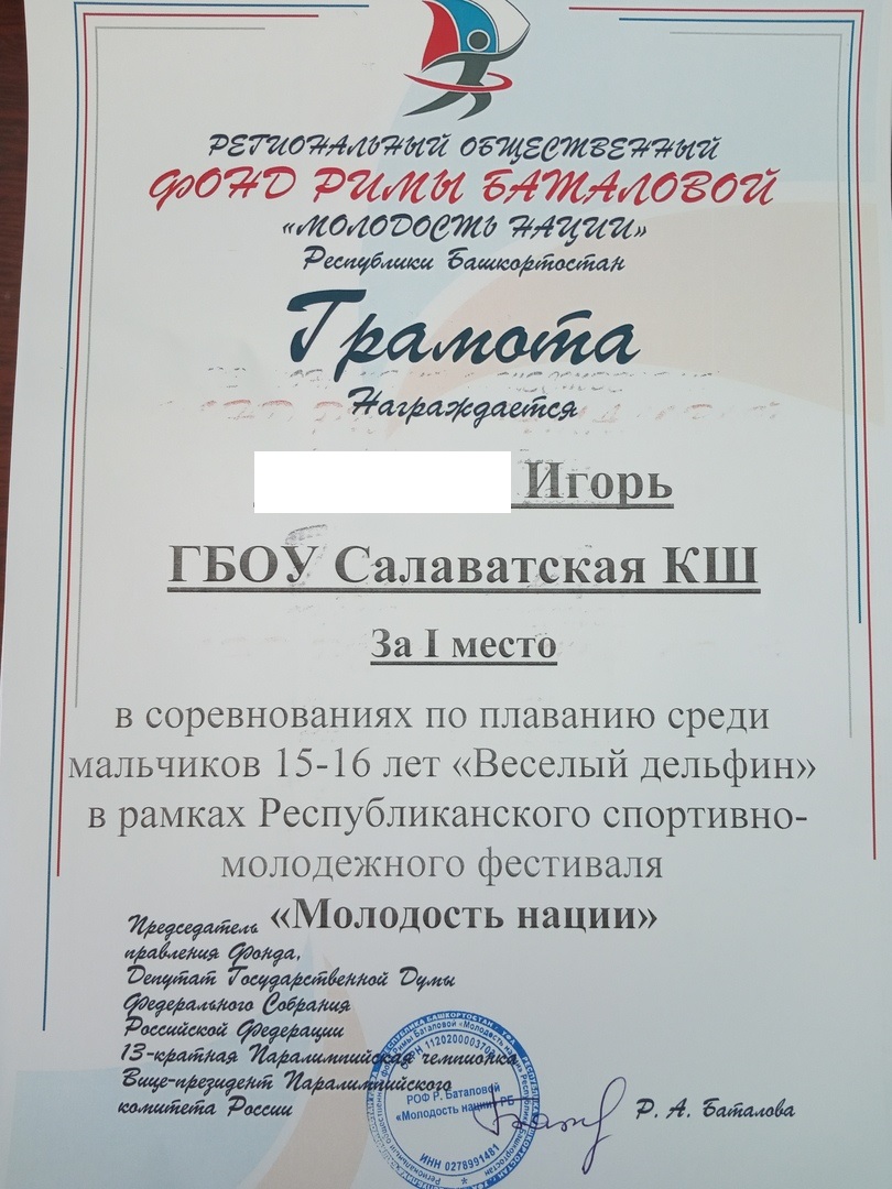 Ж.Игорь - I место в соревнованиях по плаванию среди мальчиков 15-16 лет "Весёлый дельфин";
