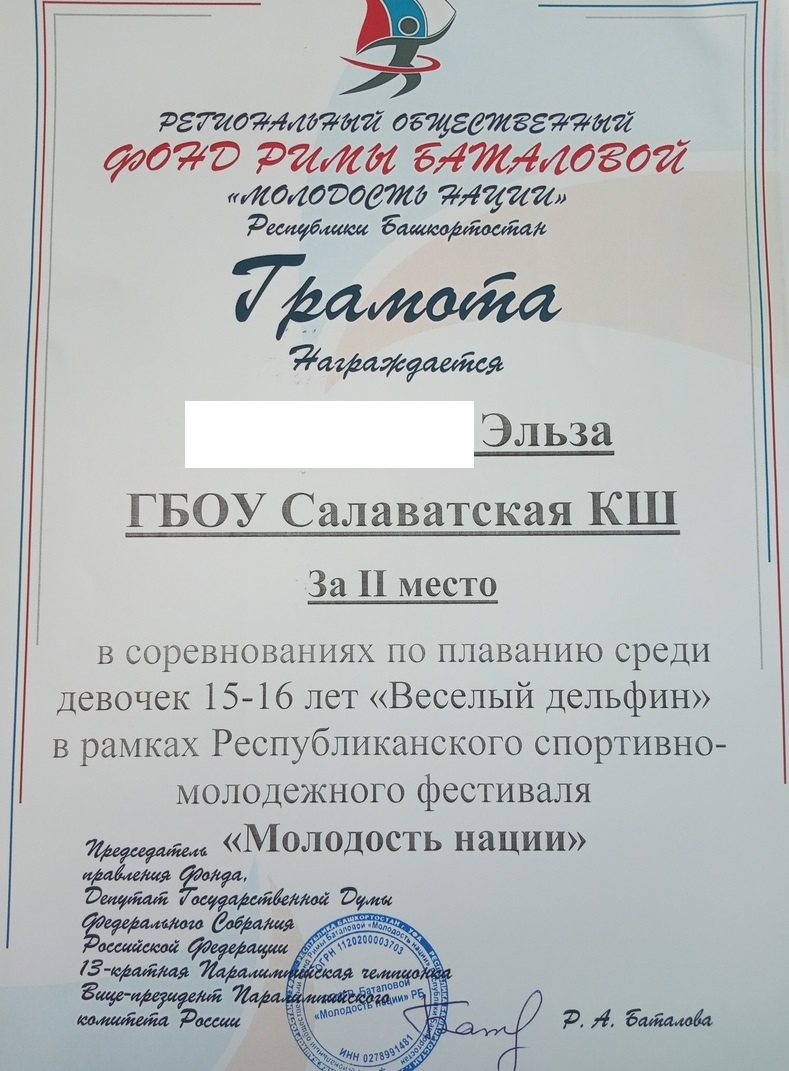 Х.Эльза - II место в соревнованиях по плаванию среди девочек 15-16 лет "Весёлый дельфин";